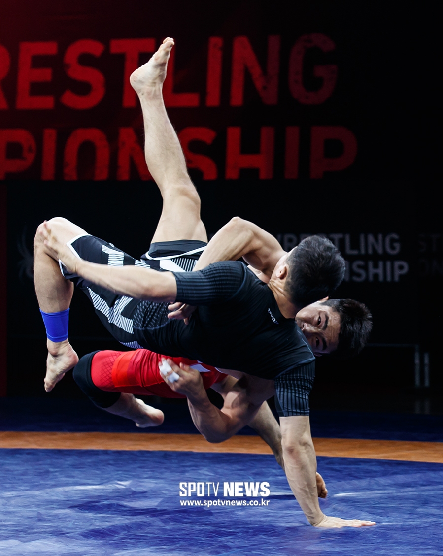 [스포티비뉴스=서울, 한희재 기자] 스파이더 레슬링 오픈 챔피언십이 21일 서울 서초구 양재동 서초종합체육관에서 열렸다. 레슬링 국가대표 공병민(붉은색)과 주짓떼로 장인성(파란색)의 스페셜 매치가 열리고 있다. 스포티비뉴스=서울, 한희재 기자