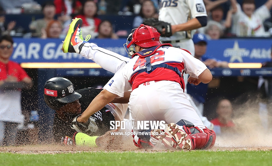 [스포티비뉴스=창원, 곽혜미 기자] 2019 KBO 리그 올스타전이 21일 오후 창원NC파크에서 열렸다. 4회초 1사 1,2루 상황에서 드림 올스타 로하스가 한동민의 적시타 때 득점을 하고 있다. 스포티비뉴스=창원, 곽혜미 기자