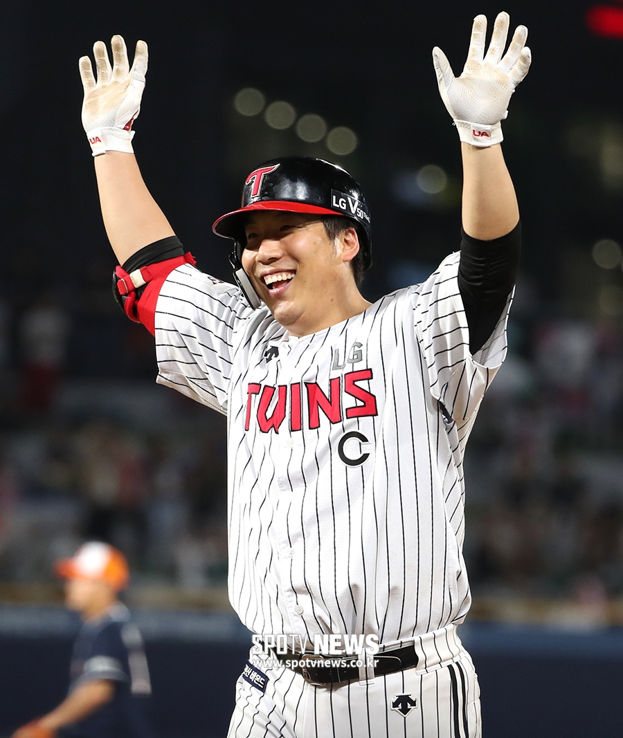 [스포티비뉴스=창원, 곽혜미 기자] 2019 KBO 리그 올스타전이 21일 오후 창원NC파크에서 열렸다. 7회말 1사 만루 상황에서 나눔 김현수가 역전 2타점 적시타를 날리고 세리머니를 하고 있다.스포티비뉴스=창원, 곽혜미 기자