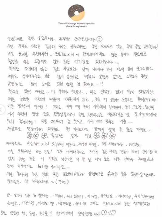 P.S. 일일이 말은 못 했지만 수환이, 우리 요한이, 두결, 승우행님, 지녁이형, 우리 병찬이형, 승연조, 세진이 형, 싸선호 형, 백진타임, 유리 형 그리고 '프로듀스X101' 동안 함께했던 모든 연습생 형, 동생, 친구들 함께해서 행복했습니다.