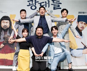 [스포티비뉴스=서울, 한희재 기자] 영화 ‘광대들 : 풍문조작단’의 제작보고회가 22일 오전 서울 강남구 CGV 압구정에서 열렸다. 배우 고창석, 김슬기, 윤박, 조진웅, 손현주, 박희순(왼쪽부터)이 사진 촬영을 위해 포즈를 취하고 있다. 스포티비뉴스=서울, 한희재 기자