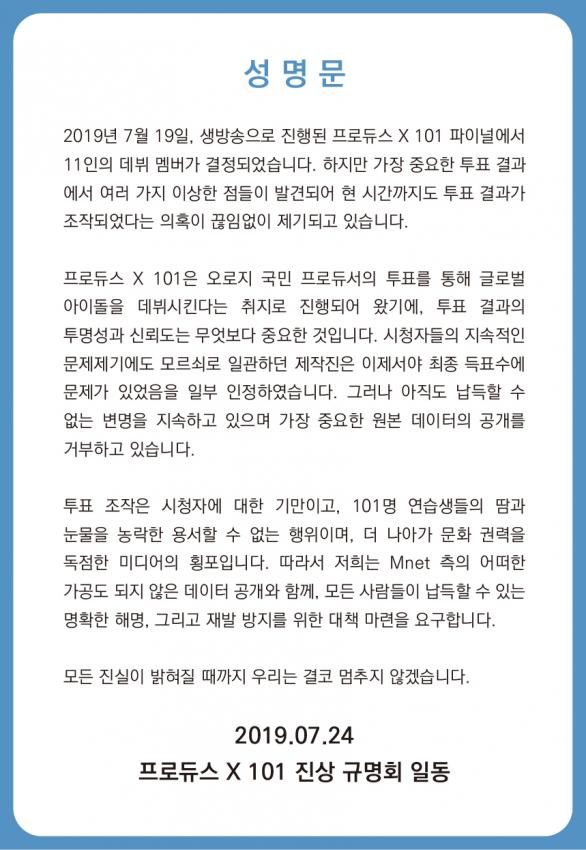 또한 엠넷 '프로듀스X101' 출연진 팬들과 시청자들은 자발적으로 '프로듀스X101' 진상규명위원회를 만들어, 25일 공식 성명서도 내고 "모든 진실이 밝혀질 때까지 우리는 결코 멈추지 않겠다"고 입장을 밝혔다.