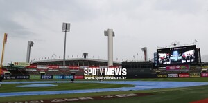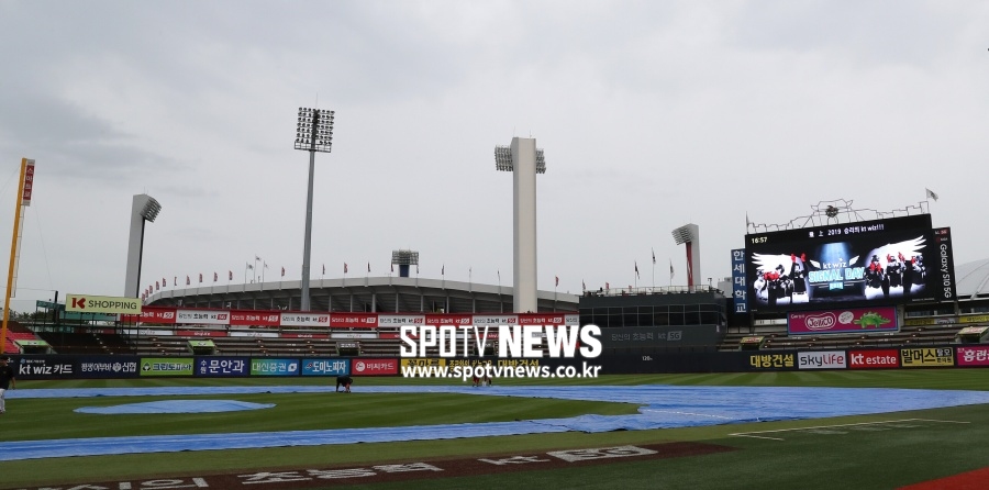 kt위즈파크에는 오전부터 계속 비가 내렸다. 오후 3시쯤부터 잠시 비가 그쳐 그라운드 정비를 진행했고 경기를 진행할 수 있는 상태까지 왔다. 그런데 오후 5시 다시 비가 세차게 쏟아지기 시작했다. 방수포가 다시 등장했다.