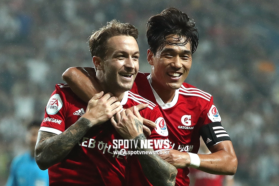 [스포티비뉴스=서울, 곽혜미 기자] 팀 K리그와 세리아A 유벤투스의 친선 경기가 26일 오후 서울 마포구 성산동 서울월드컵경기장에서 열렸다. 세 번째 골을 성공시킨 타가트가 박주영과 기쁨을 나누고 있다. 스포티비뉴스=서울, 곽혜미 기자