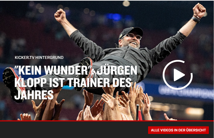 독일 유력지 '키커'는 28일(한국 시간) 홈페이지에 "리버풀의 클롭 감독이 2019년 올해의 독일 감독으로 선정됐다"고 알렸다. 클롭 감독은 이번이 세 번째 수상(2011, 2012, 2019)이다. 펠릭스 마가트 감독(2003, 2005, 2009)과 최다 수상 타이다.