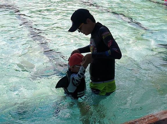 28일 신정환은 자신의 인스타그램에 "아기상어. 동네 물 맑은 풀장"이라는 문구와 사진 한 장을 게재했다.