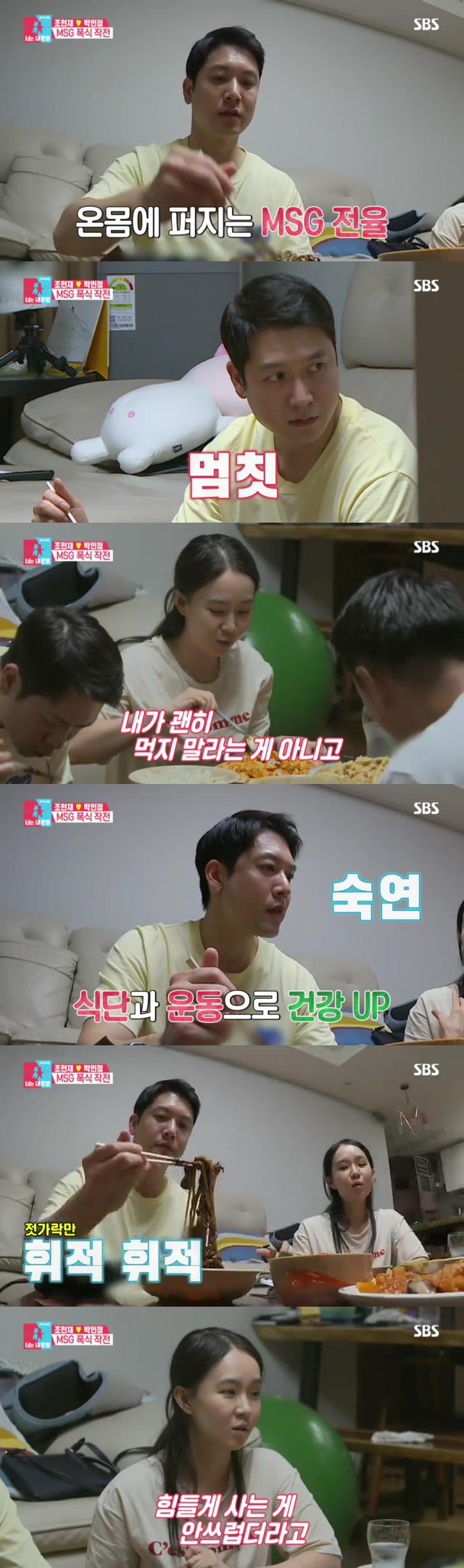 이후 조현재는 폭풍 먹방을 선보여 보는 이의 군침을 돌게 했다. 그런 조현재를 보며 박민정은 “어릴 때 몸이 약했다. 그래서 엄마가 집에서 좋은 식단으로 만들어줬고 그러다보니 몸이 건강해지더라”라며 말문을 열었다. 그러면서 박민정은 “오빠를 만났는데 경쟁이 치열한 직업이더라. 옆에서 보기에 안쓰러웠다”라며 “내 입장에서는 오빠랑 결혼하고 꼭 해주고 싶었던 게 건강한 음식이었다”라고 해 조현재를 당황하게 했다. 박민정이 그간 ‘無간’ 건강식을 고집해왔던 이유를 밝히는 장면은 공감을 이끌어내며 이날 분당 시청률 12.7%로 ‘최고의 1분’을 차지했다.