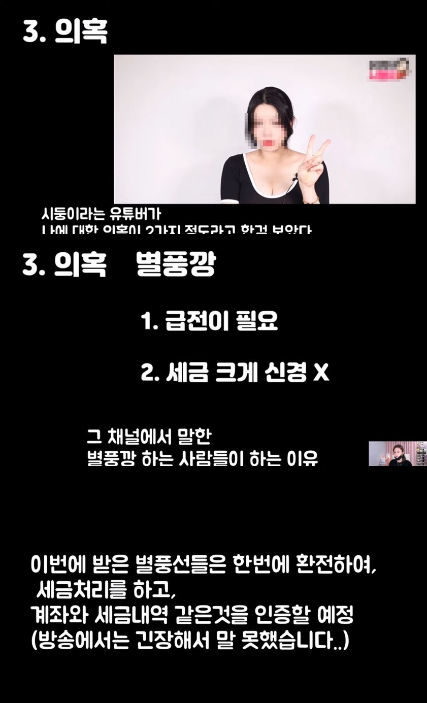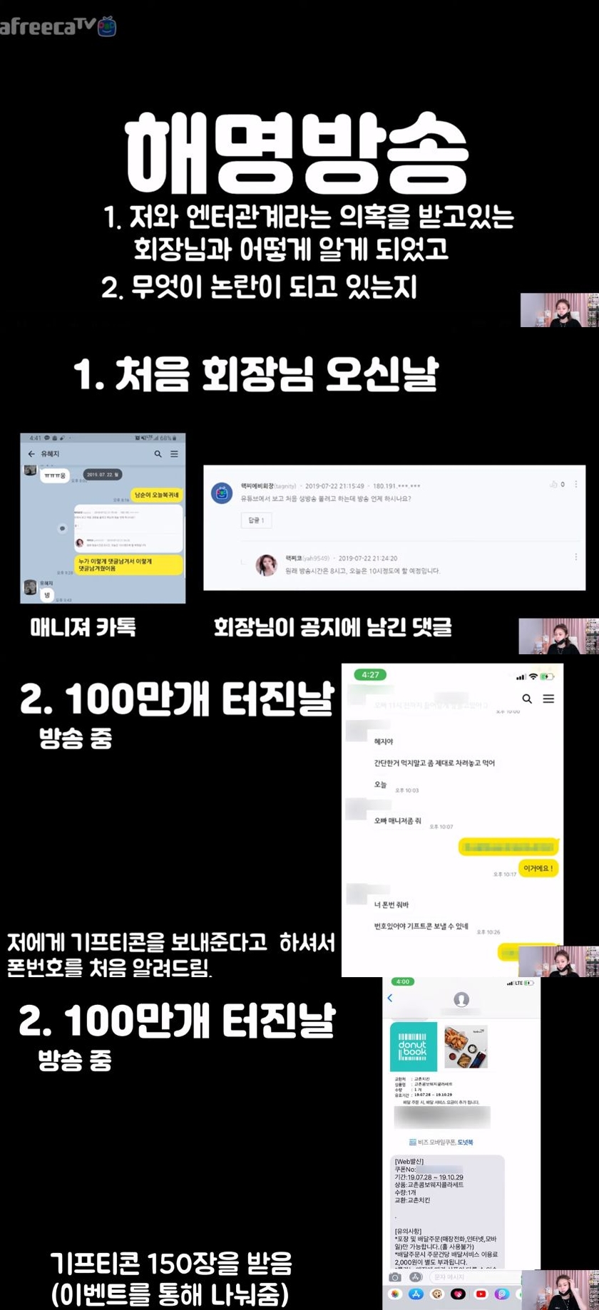 '돈세탁' 관련 이슈 역시 앞서 공개한 카카오톡 대화 내용을 언급하며 "회장님과 나눈 대화가 어떻게 업체와 한 대화로 보이느냐"며 억울함을 호소했다. 해외에서 선물받은 별풍선 내역을 공개하기도 했다.