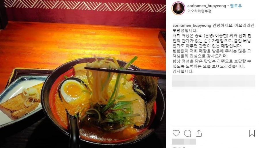 이어 아오리라멘 신림점과 부평점도 SNS 계정에 "빅뱅 승리와 저희 '아오리의행방불명(아오리라멘) 신림점'은 전혀 무관한 관계임을 알려드린다"는 글을 올리는가 하면, "저희 매장은 승리 씨와 전혀 친인척 관계가 없는 순수가맹점으로, 클럽 버닝썬과도 아무런 관련이 없는 매장"이라며 선을 그은 바 있다.