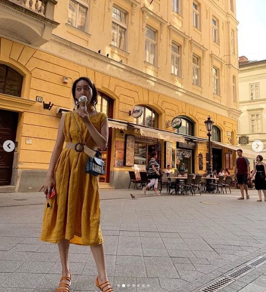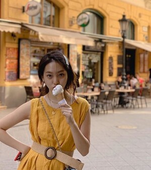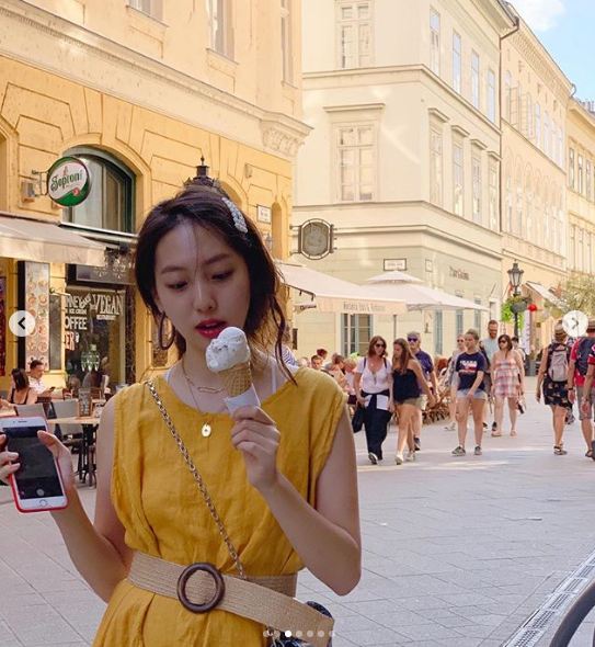 헝가리에서 노란색 드레스를 입은 이진이는 화려한 머리핀과 벨트를 착용한 모습. 아이스크림을 쥐고 연신 발랄하고 장난스러운 포즈를 취하는 이진이는 모델다운 큰 키와 날씬한 몸매를 뽐내며 눈길을 끌었다.