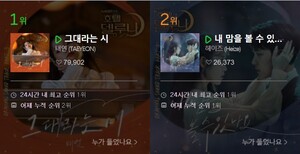 특히 태연과 헤이즈의 곡이 1위를 두고 치열한 접전을 벌이고 있다. '호텔 델루나' OST끼리의 훈훈한 경쟁이 눈길을 끈다.