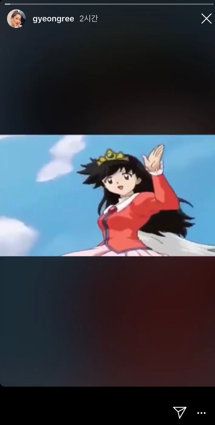 경리는 31일 자신의 인스타그램 스토리에 '퇴사짤'로 유명한 만화 '이누야샤'의 한 장면을 게재했다. 해당 영상은 만화 '이누야샤' 애니메이션 5기 24화로 이누야샤가 요괴를 퇴치하고 가영이를 데리고 멀리 하늘로 퇴장하는 장면.