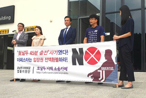 1일 오후 세곡동 더 페스타 사무실 앞에서는 '호날두 사태 소송카페' 법률지원단이 집회를 열었다. 이들은 지난달 26일 서울월드컵경기장에서 열린 팀 K리그와 유벤투스의 친선경기에서 크리스티아누 호날두가 계약과 달리 출전하지 않은 것에 분노한 팬들로부터 소송을 위임받아 29일 더 페스타를 상대로 손해배상 청구의 소를 제기했다고 밝혔다.