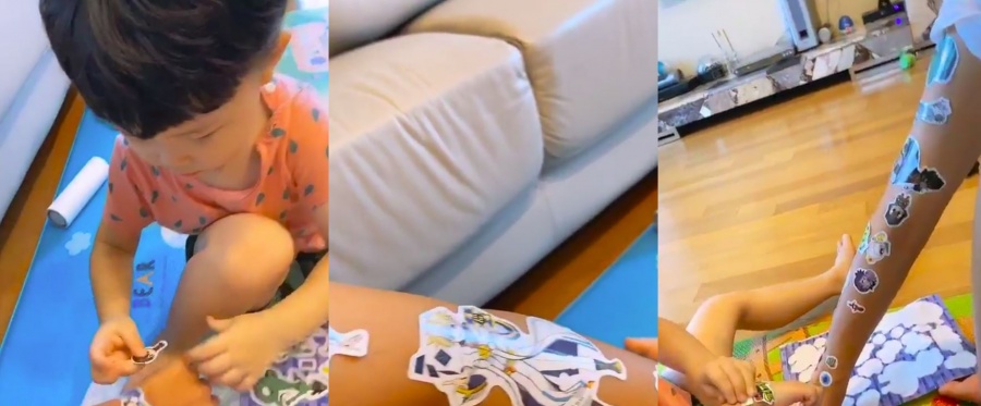 신지가 공개한 영상은 신지의 조카가 신지 팔에 스티커를 붙이고 있는 모습. 또 그가 게재한 사진에서는 매트 위에 앉아 심각한 표정을 하고 있는 신지의 모습이 담겨있다. 그의 팔에는 조카가 붙인 스티커가 잔뜩.