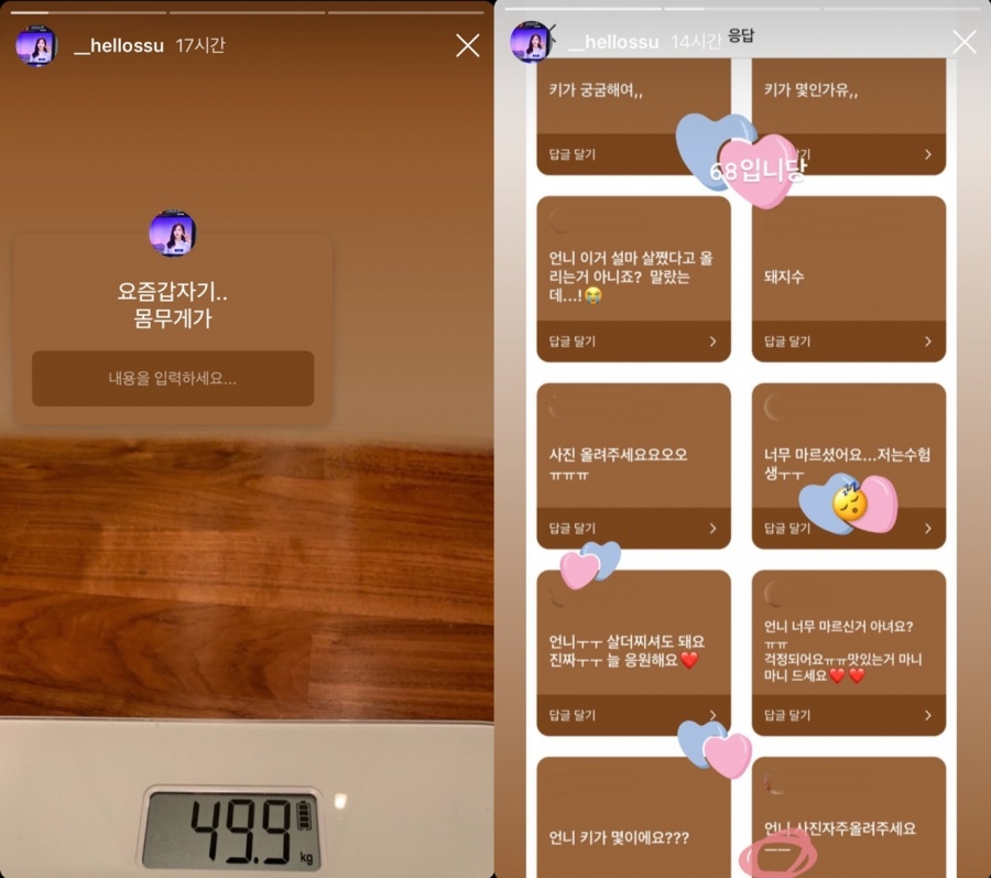 해당 사진은 '49.9kg'이 찍혀 있는 체중계 사진. 이와 함께 조수애는 누리꾼들의 질문들을 공개했는데, 많은 누리꾼들이 그에게 신장을 물었다. 이에 조수애는 "68입니다"라고 답변했다. 이로써 그는 키 168cm에 체중 49.9kg이라는 것이 밝혀졌다. 한 눈에 봐도 늘씬한 조수애답게, 큰 키와 가벼운 무게를 자랑했다.
