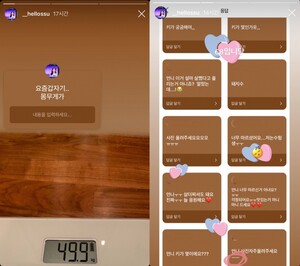 조수애는 1일 자신의 인스타그램 스토리에 "요즘 갑자기 몸무게가.."라는 글과 함께 사진을 게재했다.