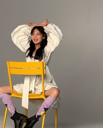 현아의 매력은 섹시함에서 끝나지 않았다. 이날 현아의 귀엽고 사랑스러운 매력이 느껴지는 사진들 역시 공개됐다. 보라색 반 스타킹을 신고 하얀색 의상을 입은 현아는 눈을 감은 채 발랄한 미소를 짓고 있어 시선을 집중시킨다. 두 팔을 하늘을 향해 뻗고 있는 자세 역시 '포즈 장인' 현아의 면모를 드러냈다.