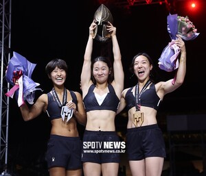 [스포티비뉴스=서울, 곽혜미 기자] 복합 스포츠 레이스 스파이더 얼티밋 챌린지(SPYDER ULTIMATE CHALLENGE) 네 번째 대회가 3일 오후 서울 중구 광화문광장에서 열렸다. 여자부 2위 이수현, 1위 황빛여울, 3위 이지윤(왼쪽부터)이 포즈를 취하고 있다. 스포티비뉴스=서울, 곽혜미 기자