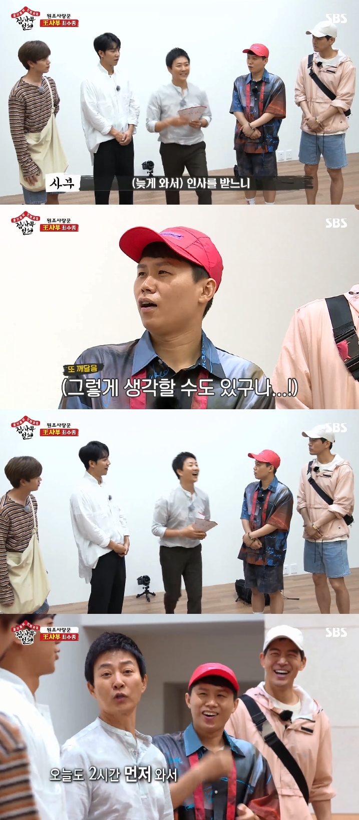 4일 방송된 SBS 예능프로그램 '집사부일체'에서는 배우 최수종이 출연했다. 이날 멤버들은 촬영장 출석시간을 체크당했고 다행히 지각자는 아무도 없었다.