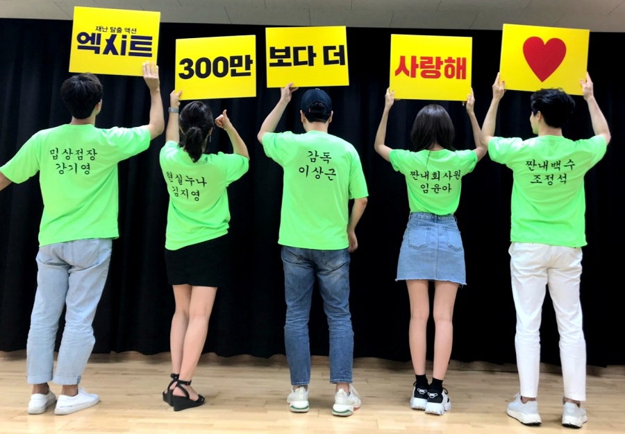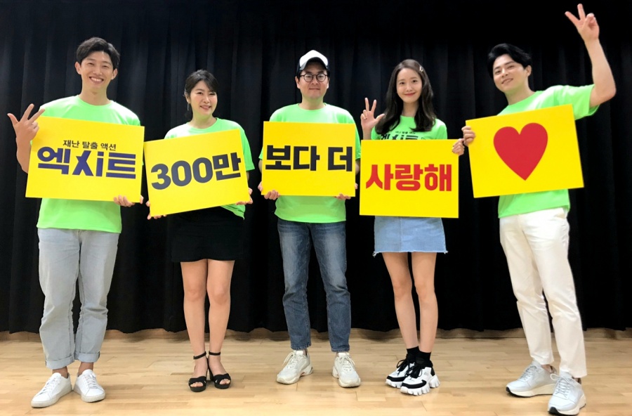 '엑시트'의 흥행 주역인 배우 조정석, 임윤아, 김지영, 강기영 그리고 이상근 감독은 관객들에게 감사 인사를 전했다. 영화 '어벤져스: 엔드게임'의 명대사 '3000만큼 사랑해'를 패러디한 '300만보다 더 사랑해♡'라는 판넬을 들고 에너지 넘치는 포즈와 밝은 미소를 보여 눈길을 끈다.