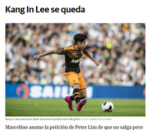 발렌시아 지역 언론 ‘라스 프로빈시아’는 5일(한국시간) “이강인은 발렌시아에 남는다(Kang In Lee se queda). 마르셀리노 가르시아 토랄 감독이 발렌시아 잔류를 암시하는 말을 했다”고 밝혔다. 스페인 언론 '아스'도 "이강인은 다음 시즌에도 발렌시아에서 뛴다. 다른 팀으로 보내지 않기로 결정했다"며 이적설 종료를 알렸다.