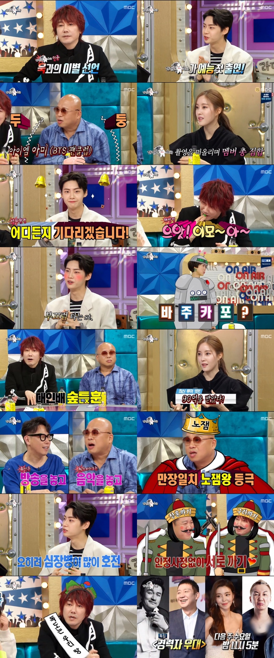 ‘라디오스타’에서 중대발표를 하겠다고 선언한 돈스파이크는 “음악을 잠시 내려놓고 예능과 음식에 집중할 것”이라고 밝혔다. 이에 윤종신은 “나랑 반대다. 나는 방송을 잠시 놓는다”라고 말해 웃음을 안겼다.