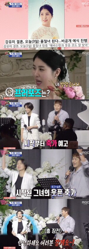 이후 강유미는 프러포즈에 대해 "강이 보이는 곳에서 반지와 장미꽃을 받았다. 아주 보편적인 프러포즈였다"라고 말하며 웃었다.