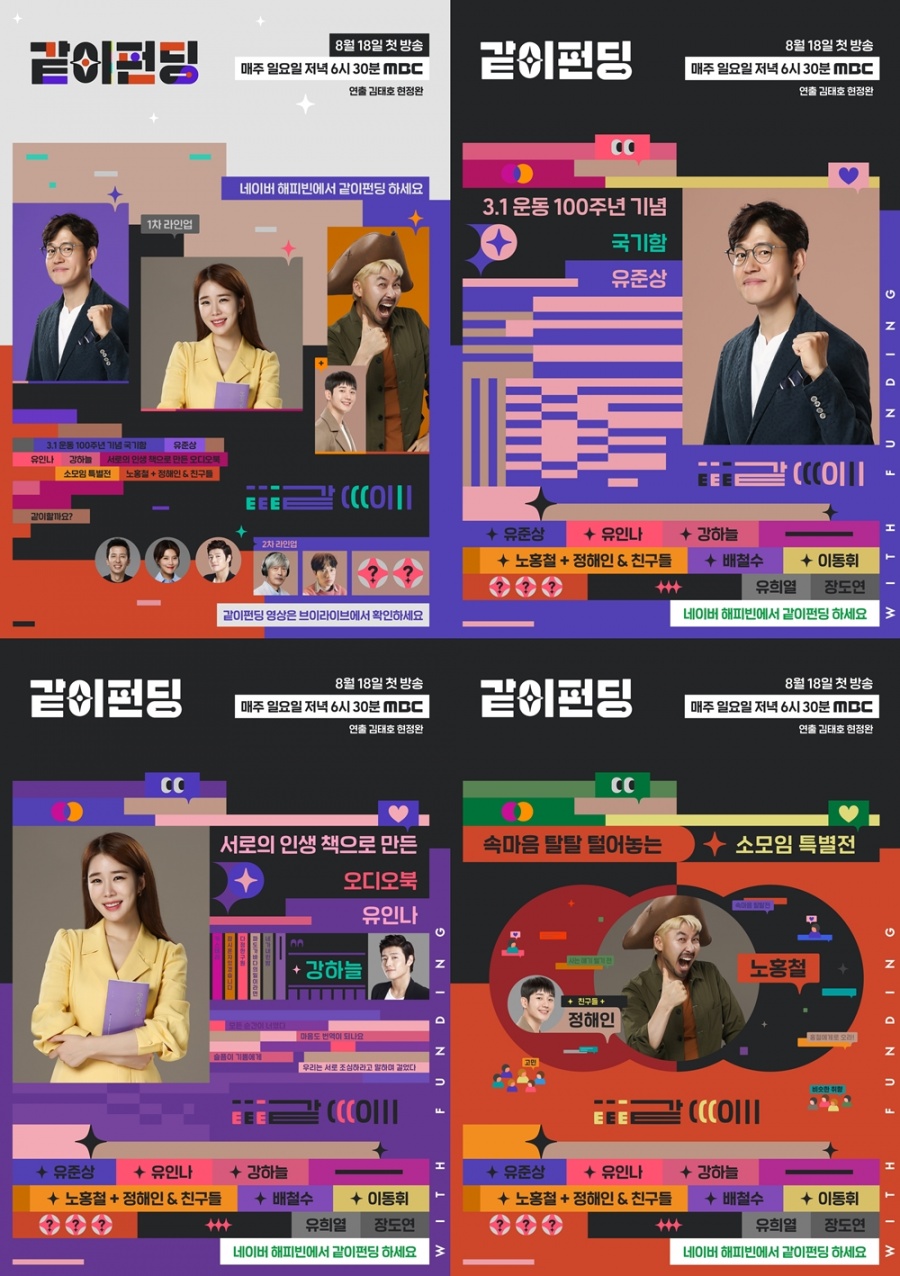 오는 18일 첫 방송을 앞둔 MBC 새 예능 프로그램 '같이 펀딩' (연출 김태호 현정완) 측은 9일 오후 네이버TV와 Vlive ‘MBC예능’ 채널을 통해 프로그램의 매력이 가득 담긴 무빙 포스터 1종을 전격 공개했다. 해당 포스터에는 앞서 1차 라인업으로 공개된 유준상, 유인나, 노홍철이 준비한 프로젝트부터 MC 유희열과 향후 프로젝트를 진행할 새로운 얼굴들이 구체적으로 공개돼 시선을 사로잡는다.