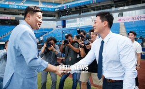 [스포티비뉴스=대구, 한희재 기자] 삼성 라이온즈와 KIA 타이거즈의 2019 KBO리그 경기가 10일 오후 대구 삼성라이온즈파크에서 열린다. 삼성에 복귀한 오승환이 처음으로 야구장을 찾아 양준혁 해설위원과 인사하고 있다. 스포티비뉴스=대구, 한희재 기자
