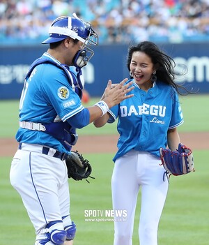 [스포티비뉴스=대구, 한희재 기자] 삼성 라이온즈와 KIA 타이거즈의 2019 KBO리그 경기가 10일 오후 대구 삼성라이온즈파크에서 열렸다. 시구를 한 가수 조정민이 삼성 포수 강민호와 하이파이브를 하고 있다. 스포티비뉴스=대구, 한희재 기자