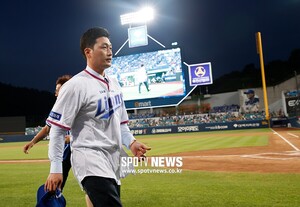 오승환은 10일 대구 삼성라이온즈파크에서 열리고 있는 2019 신한은행 MYCAR KBO리그 KIA 타이거즈와 경기 클리닝 타임에 그라운드에 나와 팬들에게 인사했다. 임대기 대표이사가 '21번 오승환'이 적힌 홈 유니폼을 직접 입혀줬다.
