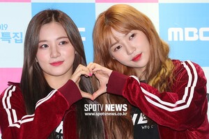 [스포티비뉴스=고양, 곽혜미 기자] MBC '2019 추석특집 아이돌스타 선수권대회' 출근길 포토월 행사가 12일 오전 경기도 고양실내체육관에서 진행됐다. 네이처 채빈, 로하가 포즈를 취하고 있다. 스포티비뉴스=고양, 곽혜미 기자