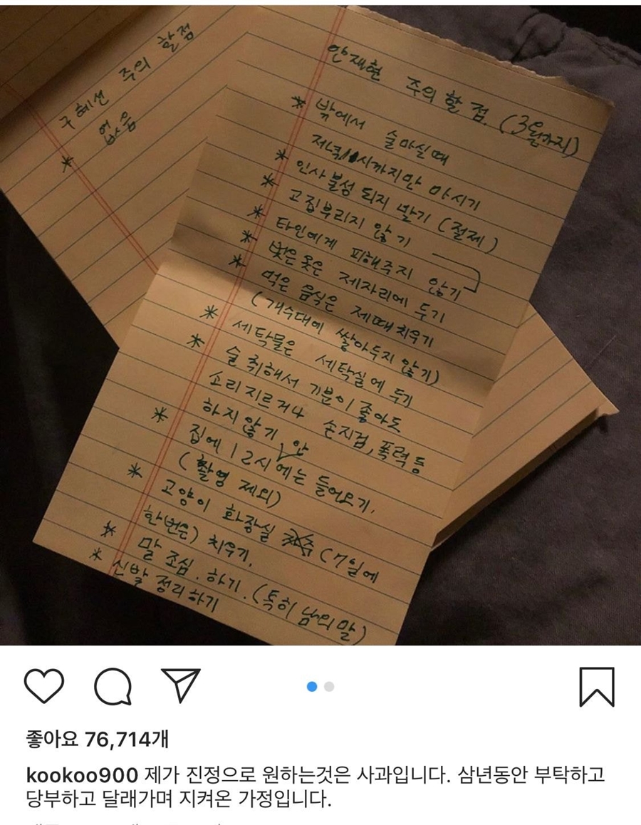 또한 구혜선은 곧이어 안재현과 자신이 나눈 각서를 공개하기도 했다. 각서에는 '손찌검하지 않기', '술은 11시까지만 마시기' 등 안재현이 지켜야 할 결혼 수칙들이 담겨 있었으나 구혜선에게는 지켜야 할 항목이 '없음'으로 적혀 있어 눈길을 끌었다.