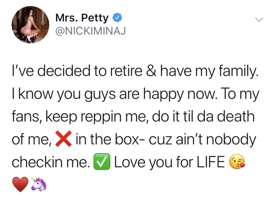 니키 미나즈는 5일(현지시간) 자신의 트위터에 "은퇴를 결심했고 가정을 꾸리기로 했다"고 전했다. 그러면서 그는 "다들 기뻐할 소식이겠지만, 내가 죽을 때까지 나를 계속 응원해달라"고 덧붙였는데, 이는 그가 앨리샤 키스의 '걸 온 파이어'에 랩 피처링을 했던 가사.