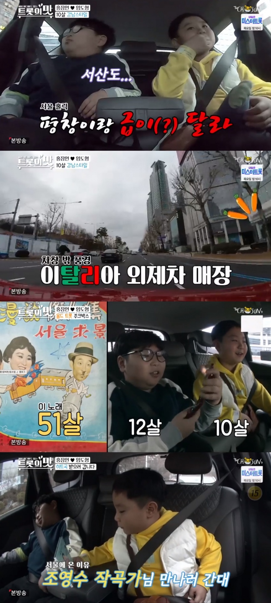 '트롯의 맛'으로 등장한 홍잠언과 임도형은 강남에 입성해 기뻐했다. "평창이랑 급이 다르다"며 감탄하던 중 외제차에도 흥분을 감추지 못했다. 두 사람은 자신들이 마치 '시골영감' 같다며 노래를 불렀고, '빈대떡 신사'를 부르며 초등학생 답지 않은 올드함을 보였다.