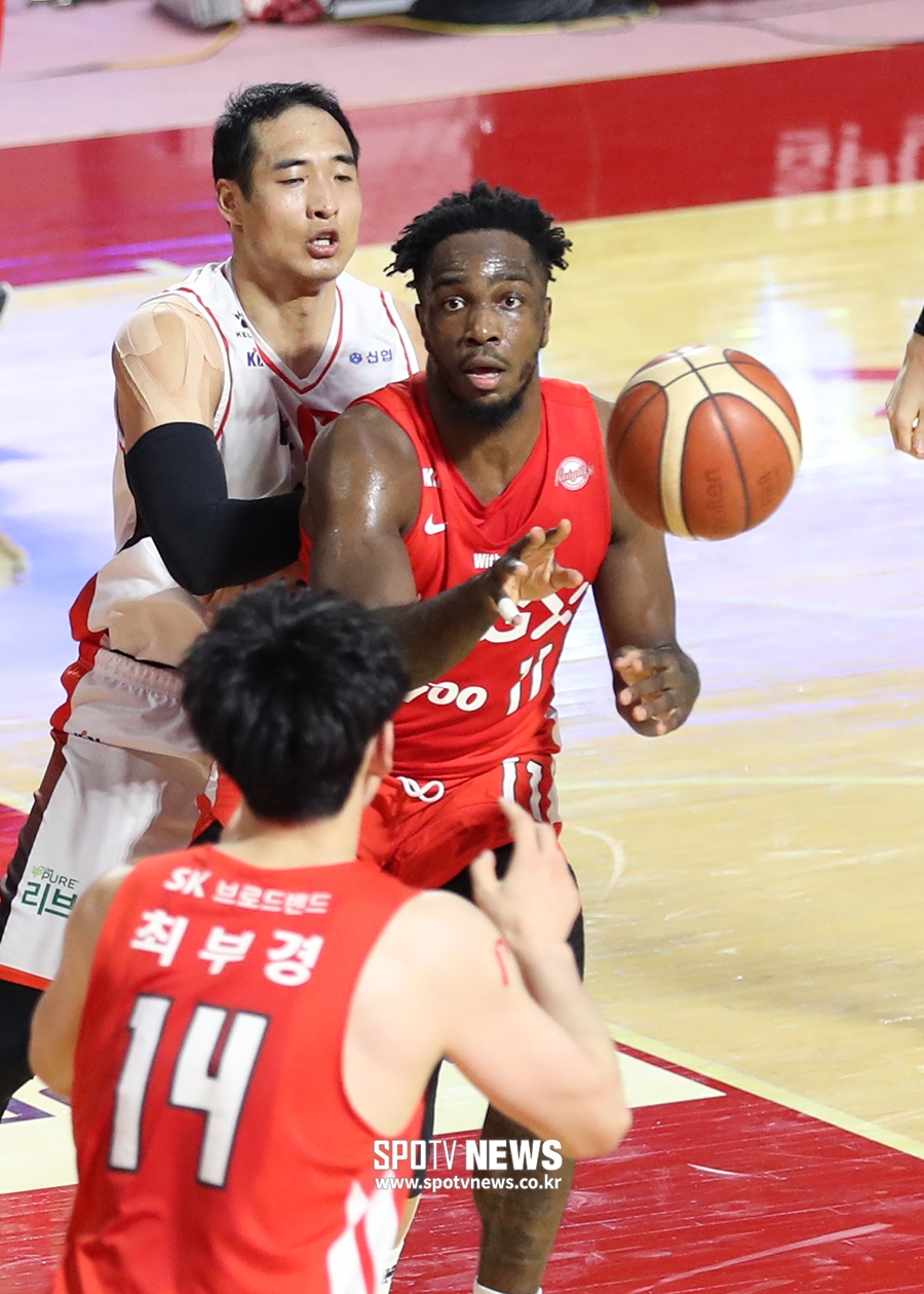 [스포티비뉴스=잠실, 곽혜미 기자] 2019-2020 현대모비스 프로농구 서울 SK와 부산 KT의 경기가 27일 오후 서울 잠실학생체육관에서 열렸다. 서울 SK 워니가 패스를 시도하고 있다.스포티비뉴스=잠실, 곽혜미 기자