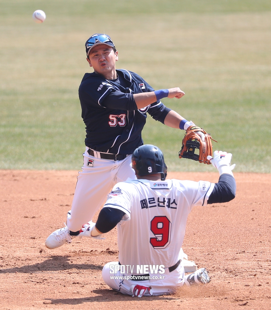 [스포티비뉴스=잠실, 곽혜미 기자] 두산 베어스 자체 청백전이 23일 오후 서울 잠실야구장에서 열렸다. 2회말 1사 1루 백팀 이흥련의 병살타 때 청팀 최주환이 1루 주자를 포스아웃 시킨 후 1루로 송구하며 병살 처리를 하고 있다. 스포티비뉴스=잠실, 곽혜미 기자