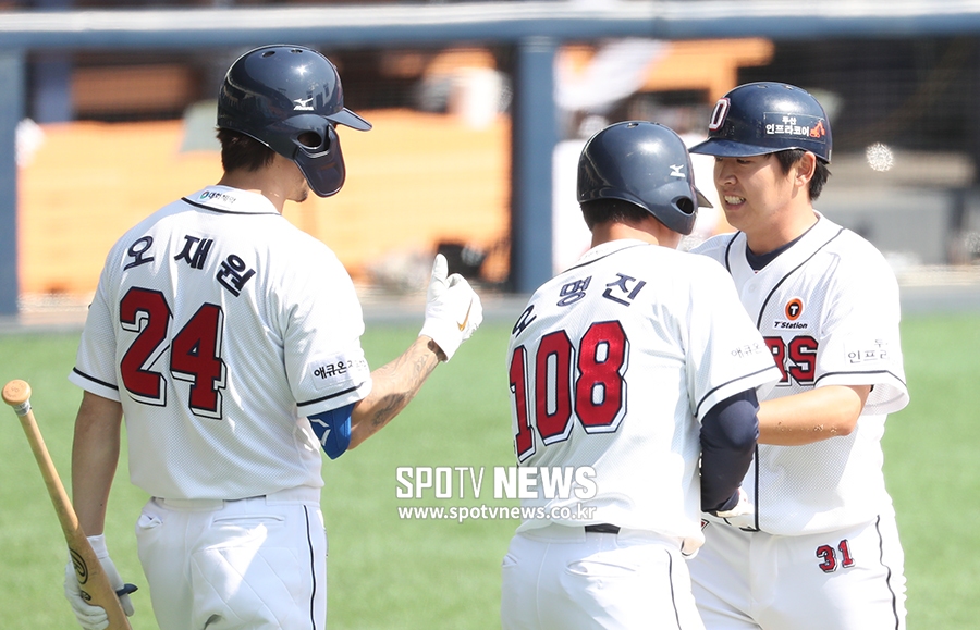 [스포티비뉴스=잠실, 곽혜미 기자] 두산 베어스 자체 청백전이 23일 오후 서울 잠실야구장에서 열렸다. 3회말 2사 1,2루 상황에서 백팀 정수빈이 그라운드 홈런을 날린 후 주자들과 하이파이브를 하고 있다. 스포티비뉴스=잠실, 곽혜미 기자