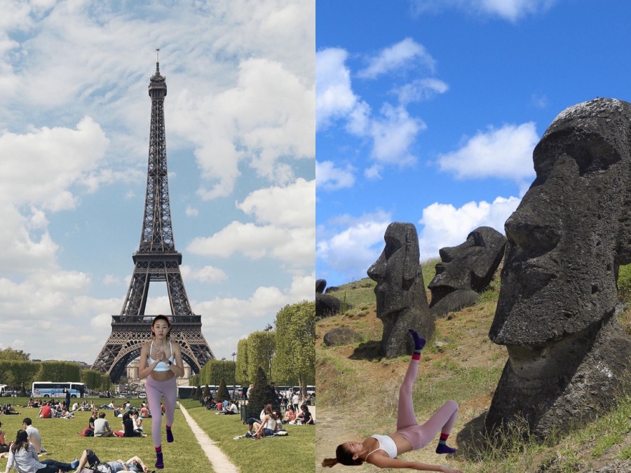 한혜진은 14일 자신의 인스타그램을 통해 "후 세계여행 힘들다"라는 짧은 글과 함께 사진 여러 장을 올렸다. 공개된 사진에는 에펠탑, 모아이 석상, 바다 등에서 운동 중인 한혜진 모습이 담겼다.