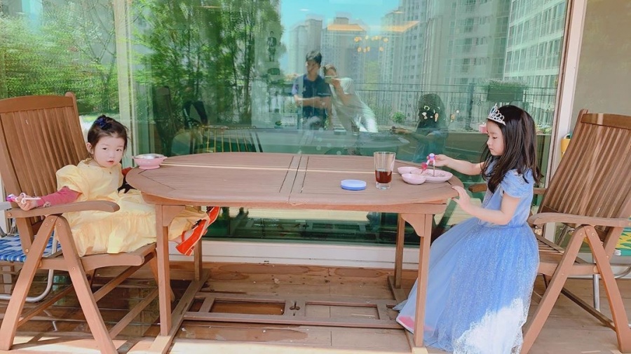 소이현은 14일 자신의 인스타그램을 통해 "공주님들 맨밥 '먹방'. 밖에서 먹어야 맛나지 암"이라는 글과 함께 사진을 올렸다. 공개된 사진에는 현재 거주 중인 집에 딸린 테라스에서 드레스를 착용한 채 밥을 먹고 있는 두 딸 모습이 담겼다.