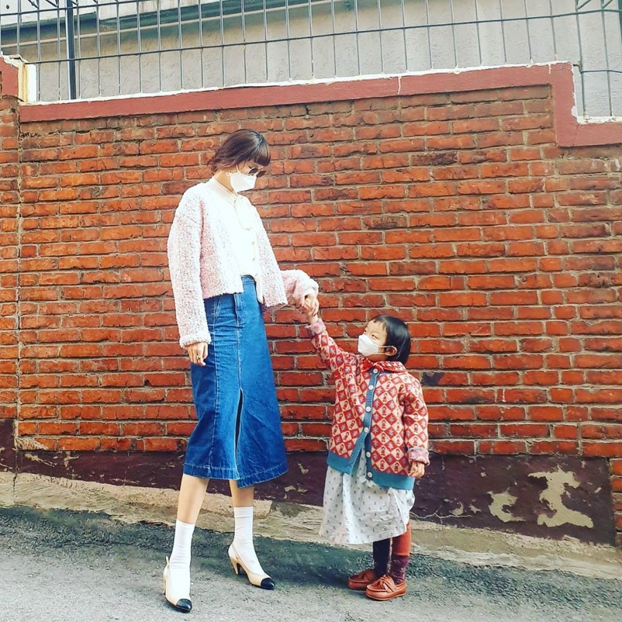 공개된 사진에는 나란히 마스크를 착용한 모녀가 남다른 패션 센스를 선보이며 서있는 모습이 담겼다. 이는 최근 코로나19 여파로 어린이집이 휴원하면서 송경아 딸 역시 어린이집을 가지 못하고 촬영장까지 함께한 것으로 보인다.