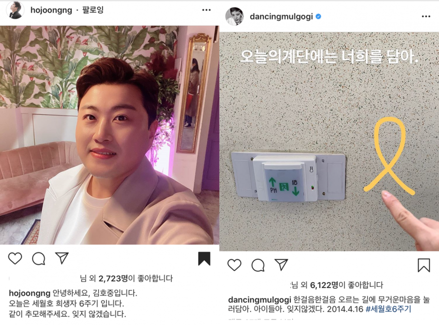 배우 이성경은 16일 자신의 인스타그램 스토리를 통해 노란 리본과 "4.16"이 적혀있는 사진을 올렸다. 트로트 가수 송가인 역시 인스타그램을 통해 "잊지 않겠습니다 2014.4.16"이라고 적힌 사진을 올리며 추모했고, '내일은 미스터트롯'에 출연하며 이름을 알린 김호중은 "오늘은 세월호 희생자 6주기입니다. 같이 추모해주세요. 잊지 않겠습니다"라고 동참했다. 함께 '미스터트롯'에 출연했던 노지훈 또한 "부모가 되어보니.. 더 잊지 않겠습니다"라며 글을 적었다.