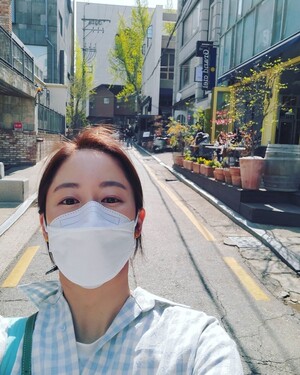 전혜빈은 15일 자신의 인스타그램을 통해 "요즘"이라는 문구와 함께 사진을 올렸다. 공개된 사진에는 하늘색 상의와 마스크를 착용한 전혜빈이 외출에 나선 모습이 담겼다.