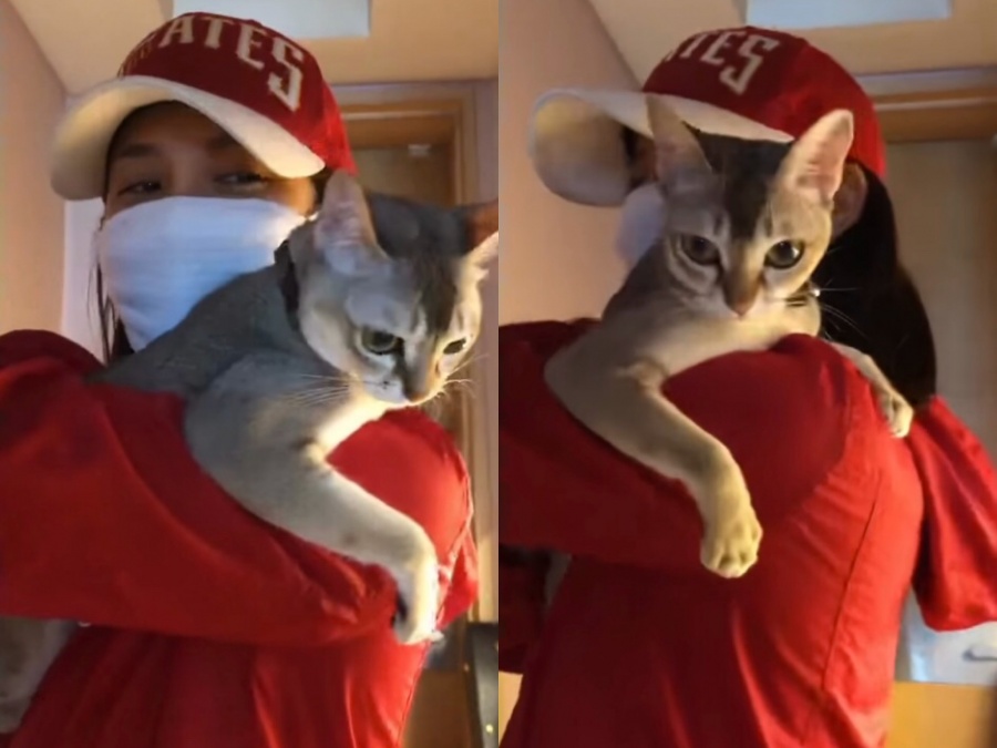 공개된 사진에는 빨간색으로 '깔맞춤'한 모자와 상의 그리고 마스크를 착용한 조여정이 조심스럽게 고양이를 안은 채 토닥이고 있다.
