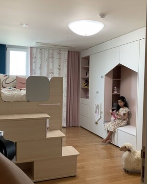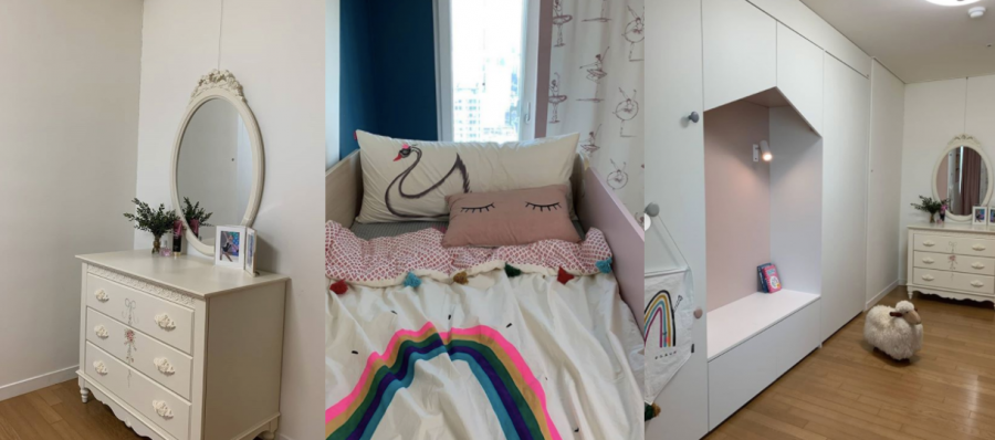 이와 함께 공개된 사진에는 방 한 쪽 면을 차지하고 있는 큰 붙박이장과 2층 침대, 화장대가 담겨있다. 특히 붙박이장 가운데가 벤치와 수납공간으로 매립돼 눈길을 끌고 있다.