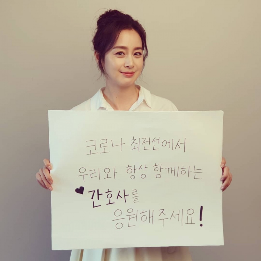 공개된 사진에는 "코로나 최전선에서 우리와 항상 함께하는 간호사를 응원해 주세요"라는 메시지가 적힌 종이를 들고 있는 김태희 모습이 담겼다.