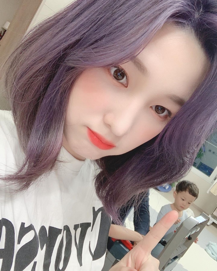 율희는 17일 자신의 인스타그램을 통해 별다른 코멘트 없이 사진을 올렸다. 공개된 사진에는 최근 머리를 보라색으로 염색한 율희가 손가락으로 아들 재율 군을 가리키고 있다.