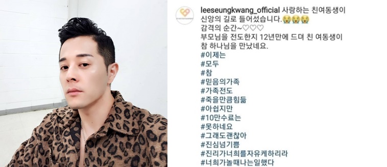 이승광은 작년 11월 인스타그램에 "사랑하는 친여동생이 신앙의 길로 들어섰다. 부모님을 전도한지 12년 만에 드디어 친여동생이 참 하나님을 만났다"는 글을 올렸다. 이 글과 "이제는 모두 참 믿음의 가족. 가족 전도. 죽을 만큼 힘듦. 아쉽지만 10만 수료는 못하네요. 그래도 괜찮아. 진심 넘 기쁨. 진리가 너희를 자유케 하리라. 너희가 놀 때 나는 일했다"라는 태그들을 덧붙였다.