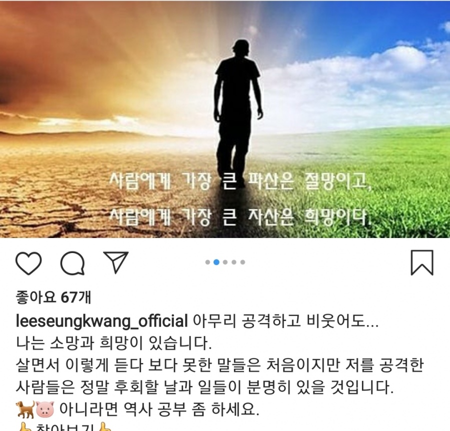 이승광은 18일 자신의 인스타그램 계정에 "아무리 공격하고 비웃어도 나는 소망과 희망이 있습니다. 살면서 이렇게 듣지도 보지도 못한 말들은 처음이지만 저를 공격한 사람들은 정말 후회할 날과 일들이 분명히 있을 것입니다"라는 글을 올렸다.