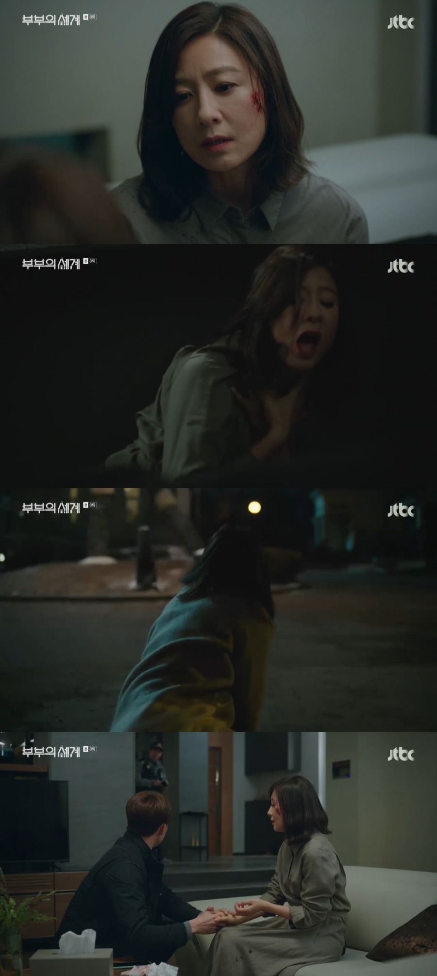18일 방송된 JTBC스튜디오의 오리지널 금토드라마 '부부의 세계'(연출 모완일, 극본 주현) 8회에서 지선우(김희애)는 아들을 이태오(박해준) 집으로 보낸 후 홀로 집에서 와인을 마시며 책을 읽던 중 괴한의 침입을 당한다.